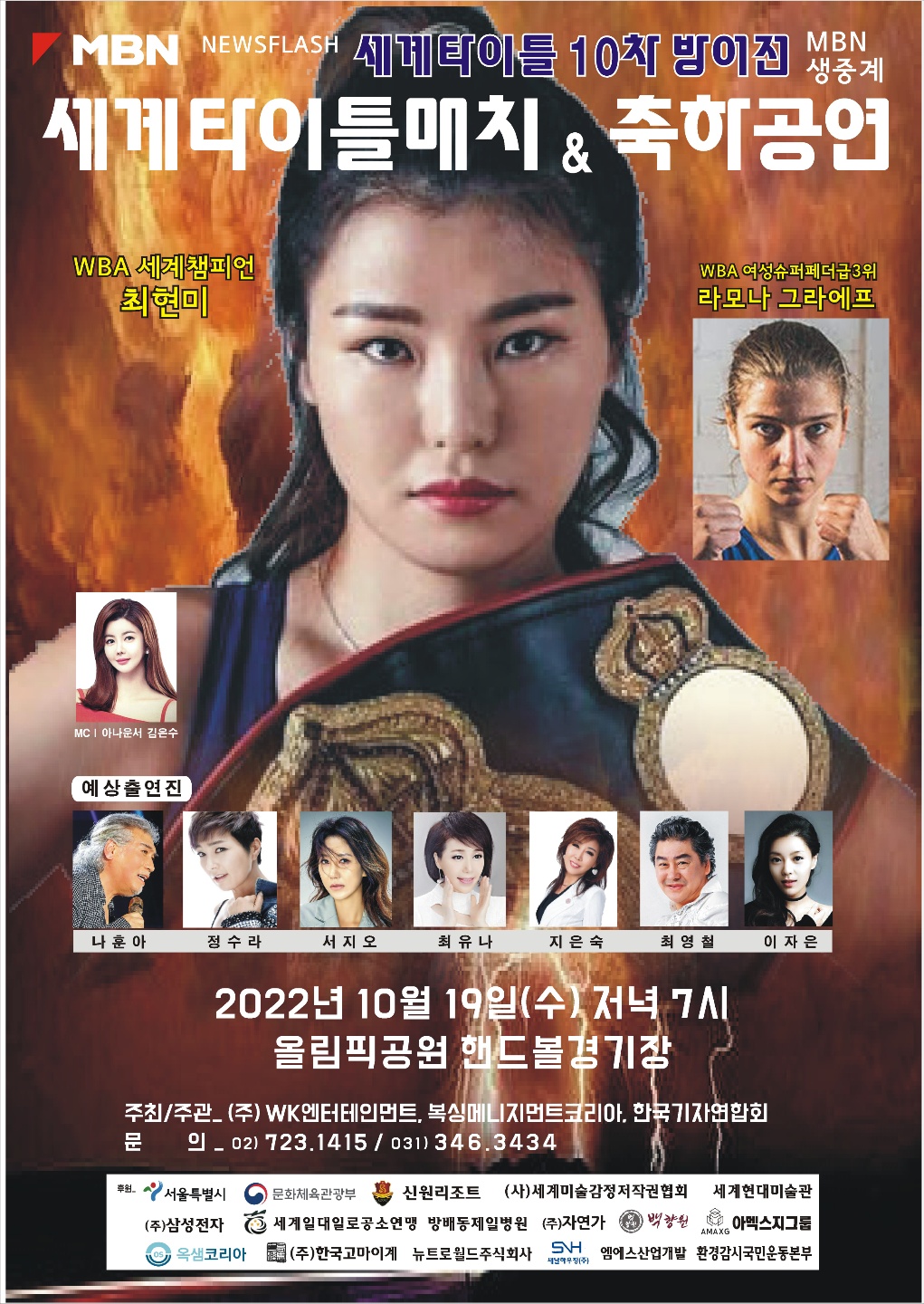 WBA 세계챔피언 최현미의 세계타이틀매치 &축하공연이 MBN 생중계 2022년 10월 19일(수)저녁 7시 올림픽공원 핸드볼경기장에서 진행될 예정입니다.