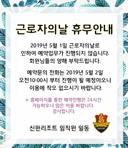 2019년 05월 01일 근로자의날로 인하여 예약업무가 진행되지 않습니다. 예약문의 전화는 2019년 5월 2일 오전10:00시 부터 진행이 될 예정이오니 이용에 착오 없으시기 바랍니다. ※ 홈페이지를 통한 예약진행은 24시간 가능하오니 많은 이용 바랍니다. 감사합니다.