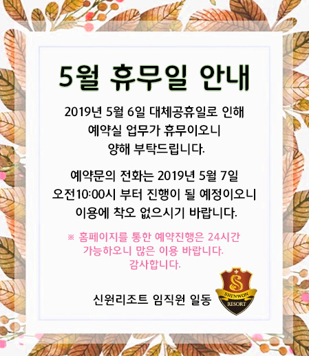 예약실 업무가 휴무이오니 양해 부탁드립니다. 예약문의 전화는 2019년 5월 7일 오전10:00시 부터 진행이 될 예정이오니 이용에 착오 없으시기 바랍니다. ※ 홈페이지를 통한 예약진행은 24시간 가능하오니 많은 이용 바랍니다. 감사합니다.